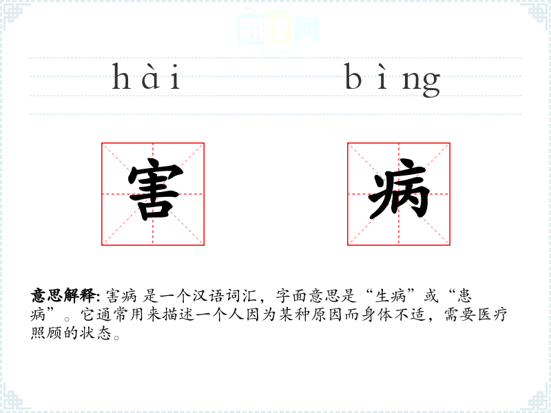 害病 是一个汉语词汇,字面意思是“生病”或“患病”。它通常用来描述一个人因为某种原因而身体不适,需要医疗照顾的状态。