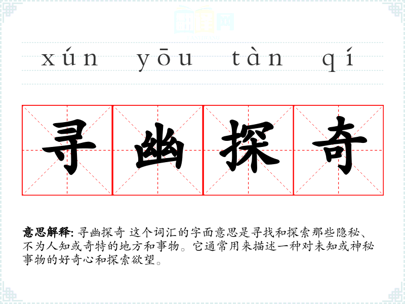 寻幽探奇 这个词汇的字面意思是寻找和探索那些隐秘、不为人知或奇特的地方和事物。它通常用来描述一种对未知或神秘事物的好奇心和探索欲望。