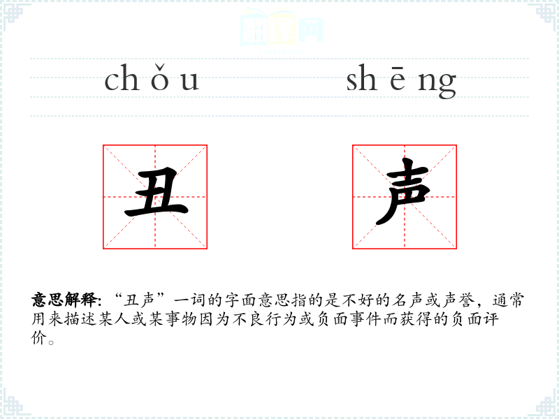 在英语中,“丑声”可以对应为“bad reputation”或“ill fame”,但其使用和文化背景可能有所不同。