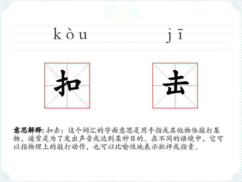 扣击:这个词汇的字面意思是用手指或其他物体敲打某物,通常是为了发出声音或达到某种目的。在不同的语境中,它可以指物理上的敲打动作,也可以比喻性地表示批评或指责。
