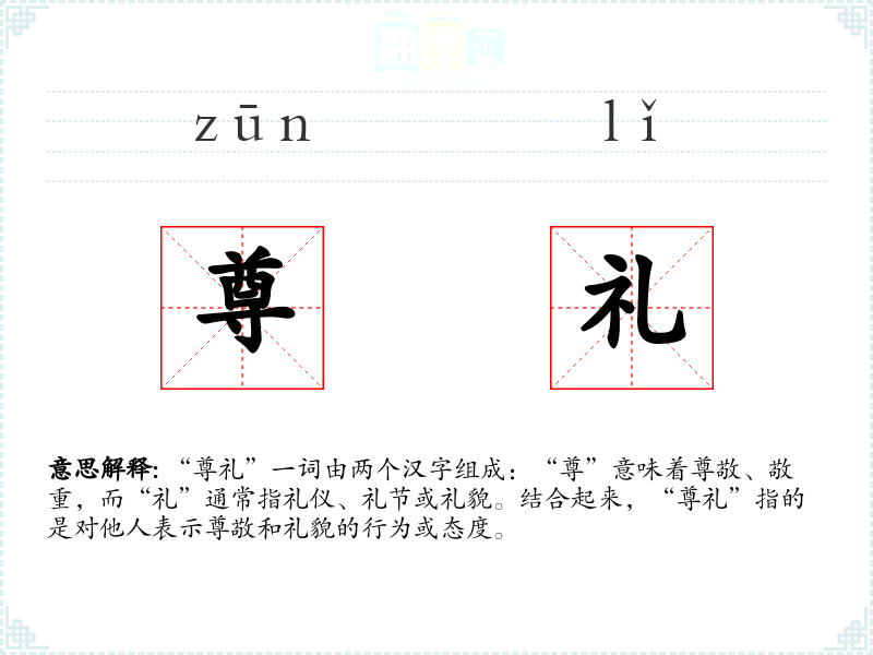 “尊礼”一词由两个汉字组成:“尊”意味着尊敬、敬重,而“礼”通常指礼仪、礼节或礼貌。结合起来,“尊礼”指的是对他人表示尊敬和礼貌的行为或态度。