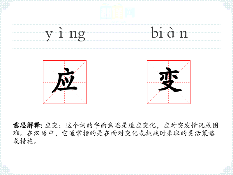 应变:这个词的字面意思是适应变化,应对突发情况或困难。在汉语中,它通常指的是在面对变化或挑战时采取的灵活策略或措施。