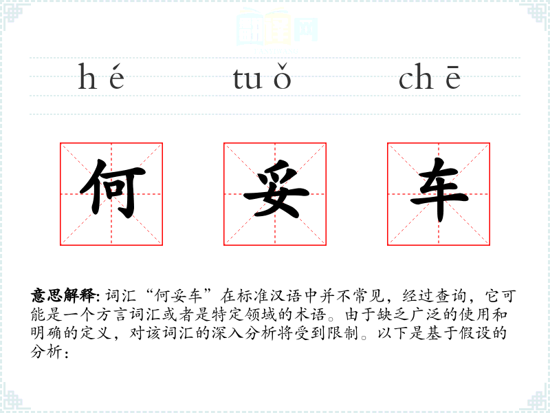 词汇“何妥车”在标准汉语中并不常见,经过查询,它可能是一个方言词汇或者是特定领域的术语。由于缺乏广泛的使用和明确的定义,对该词汇的深入分析将受到限制。以下是基于假设的分析:
