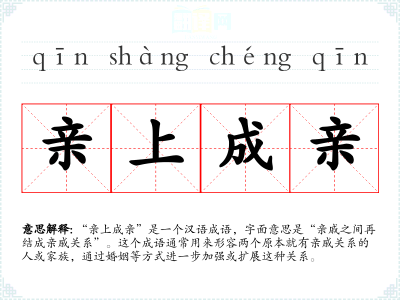 “亲上成亲”是一个汉语成语,字面意思是“亲戚之间再结成亲戚关系”。这个成语通常用来形容两个原本就有亲戚关系的人或家族,通过婚姻等方式进一步加强或扩展这种关系。
