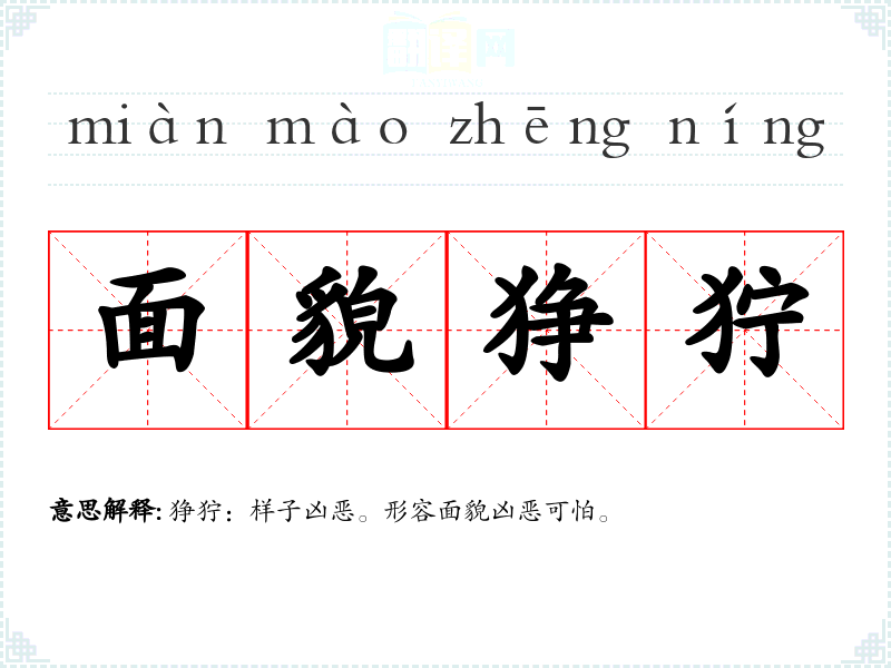 狰狞:样子凶恶。形容面貌凶恶可怕。
