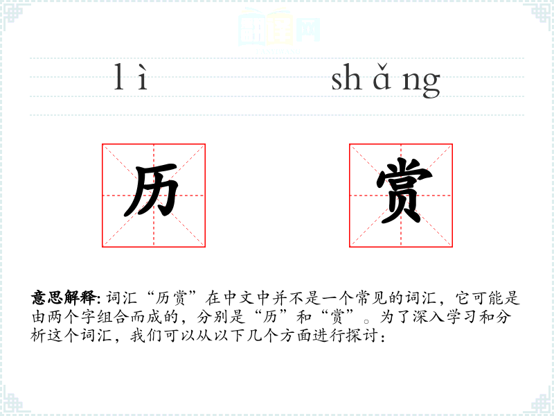 词汇“历赏”在中文中并不是一个常见的词汇,它可能是由两个字组合而成的,分别是“历”和“赏”。为了深入学*和分析这个词汇,我们可以从以下几个方面进行探讨: