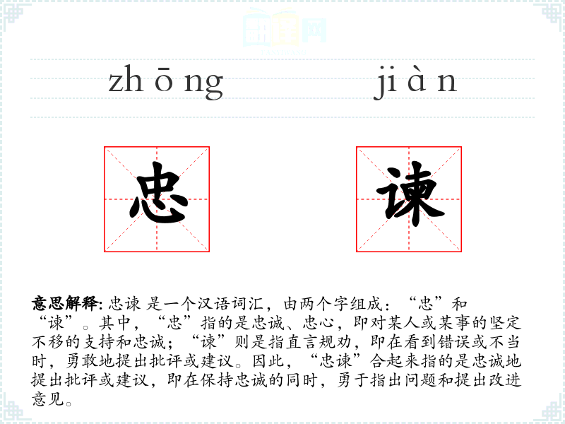 - 专业领域:在管理学或组织行为学中,“忠谏”可以指员工对管理层的建设性批评,强调在保持忠诚的同时提出改进建议。