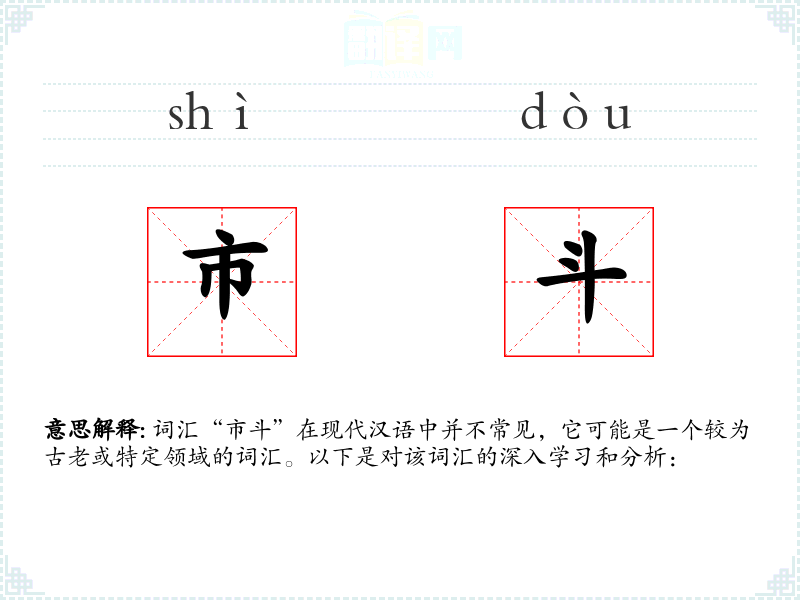 词汇“市斗”在现代汉语中并不常见,它可能是一个较为古老或特定领域的词汇。以下是对该词汇的深入学习和分析: