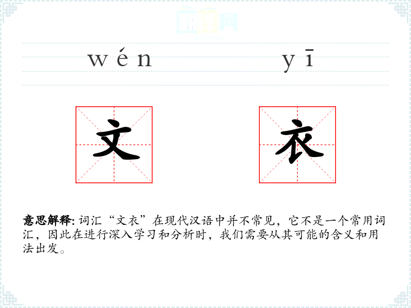 词汇“文衣”在现代汉语中并不常见,它不是一个常用词汇,因此在进行深入学习和分析时,我们需要从其可能的含义和用法出发。