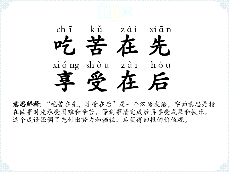 “吃苦在先,享受在后”是一个汉语成语,字面意思是指在做事时先承受困难和辛苦,等到事情完成后再享受成果和快乐。这个成语强调了先付出努力和牺牲,后获得回报的价值观。