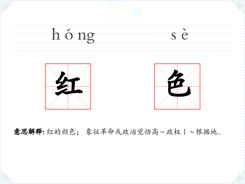 红的颜色; 象征革命或政治觉悟高~政权丨~根据地。