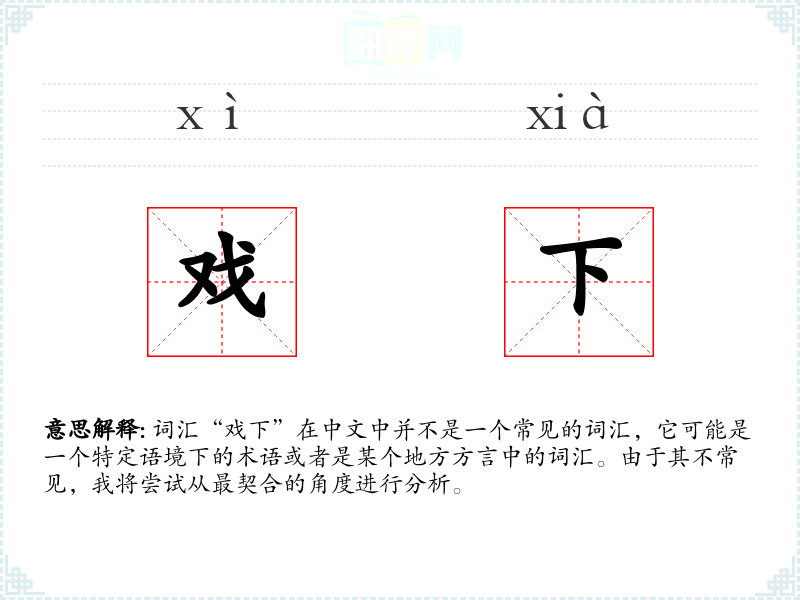 词汇“戏下”在中文中并不是一个常见的词汇,它可能是一个特定语境下的术语或者是某个地方方言中的词汇。由于其不常见,我将尝试从最契合的角度进行分析。