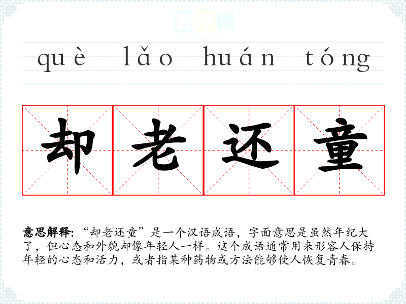 “却老还童”是一个汉语成语,字面意思是虽然年纪大了,但心态和外貌却像年轻人一样。这个成语通常用来形容人保持年轻的心态和活力,或者指某种药物或方法能够使人恢复青春。