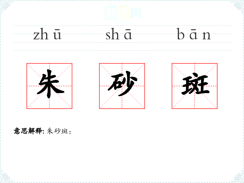 - 字面意思:朱砂,一种红色的矿物,常用于传统中药和颜料;斑,指斑点或斑纹。