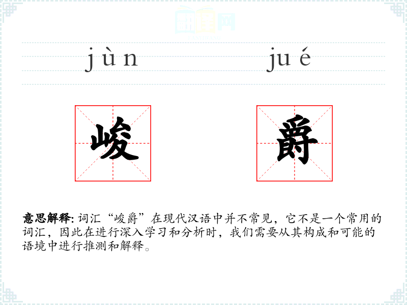 词汇“峻爵”在现代汉语中并不常见,它不是一个常用的词汇,因此在进行深入学*和分析时,我们需要从其构成和可能的语境中进行推测和解释。