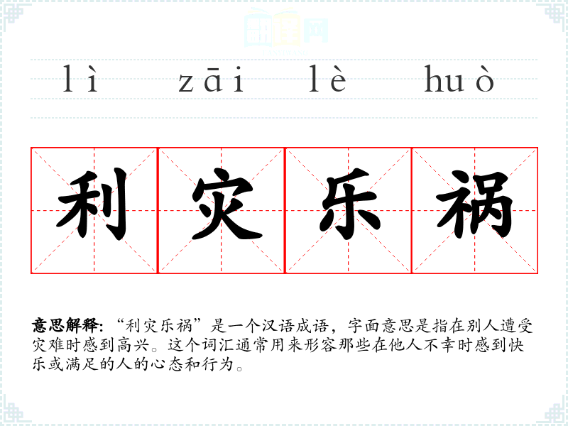 “利灾乐祸”是一个汉语成语,字面意思是指在别人遭受灾难时感到高兴。这个词汇通常用来形容那些在他人不幸时感到快乐或满足的人的心态和行为。