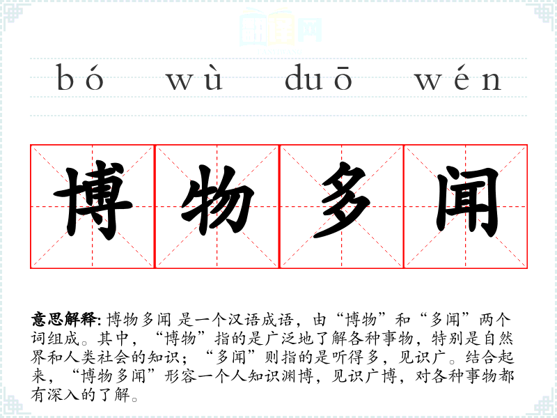 博物多闻 是一个汉语成语,由“博物”和“多闻”两个词组成。其中,“博物”指的是广泛地了解各种事物,特别是自然界和人类社会的知识;“多闻”则指的是听得多,见识广。结合起来,“博物多闻”形容一个人知识渊博,见识广博,对各种事物都有深入的了解。