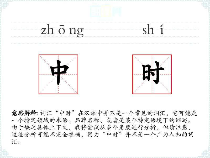 由于“中时”不是一个标准词汇,我们无法给出确切的基本定义。它可能是指“中间的时间”或“中等的时刻”,但这只是基于字面意思的猜测。