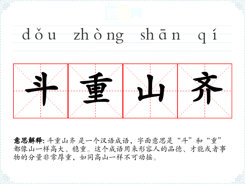斗重山齐 是一个汉语成语,字面意思是“斗”和“重”都像山一样高大、稳重。这个成语用来形容人的品德、才能或者事物的分量非常厚重,如同高山一样不可动摇。