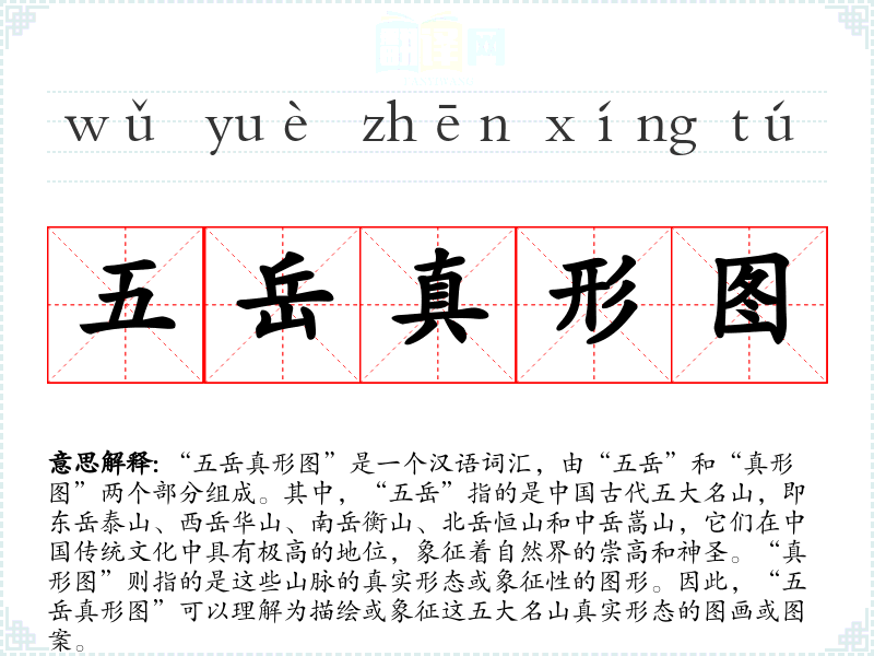 “五岳真形图”是一个汉语词汇,由“五岳”和“真形图”两个部分组成。其中,“五岳”指的是古代五大名山,即东岳泰山、西岳华山、南岳衡山、北岳恒山和中岳嵩山,它们在传统文化中具有极高的地位,象征着自然界的崇高和神圣。“真形图”则指的是这些山脉的真实形态或象征性的图形。因此,“五岳真形图”可以理解为描绘或象征这五大名山真实形态的图画或图案。