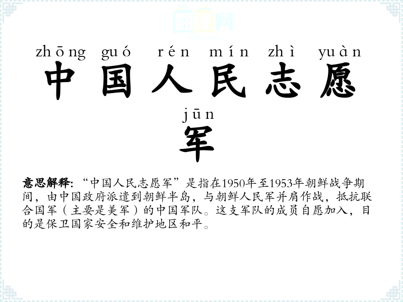 在其他语言中,如英语,可能会使用“Chinese People's Volunteer Army”来对应这个词汇。在不同文化中,这个词汇都代表了在特定历史背景下的军事行动和牺牲精神。