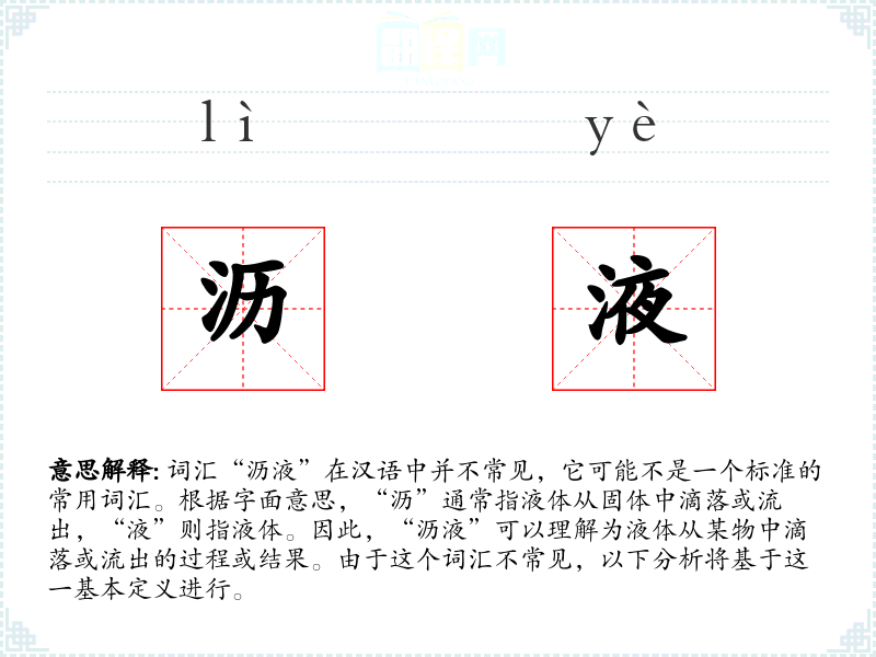 词汇“沥液”在汉语中并不常见,它可能不是一个标准的常用词汇。根据字面意思,“沥”通常指液体从固体中滴落或流出,“液”则指液体。因此,“沥液”可以理解为液体从某物中滴落或流出的过程或结果。由于这个词汇不常见,以下分析将基于这一基本定义进行。