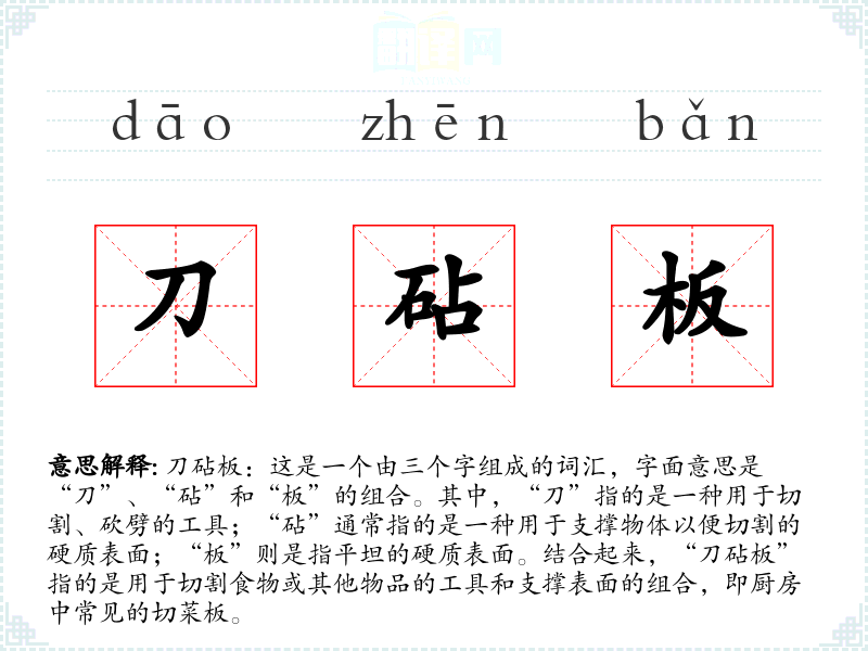 刀砧板:这是一个由三个字组成的词汇,字面意思是“刀”、“砧”和“板”的组合。其中,“刀”指的是一种用于切割、砍劈的工具;“砧”通常指的是一种用于支撑物体以便切割的硬质表面;“板”则是指平坦的硬质表面。结合起来,“刀砧板”指的是用于切割食物或其他物品的工具和支撑表面的组合,即厨房中常见的切菜板。