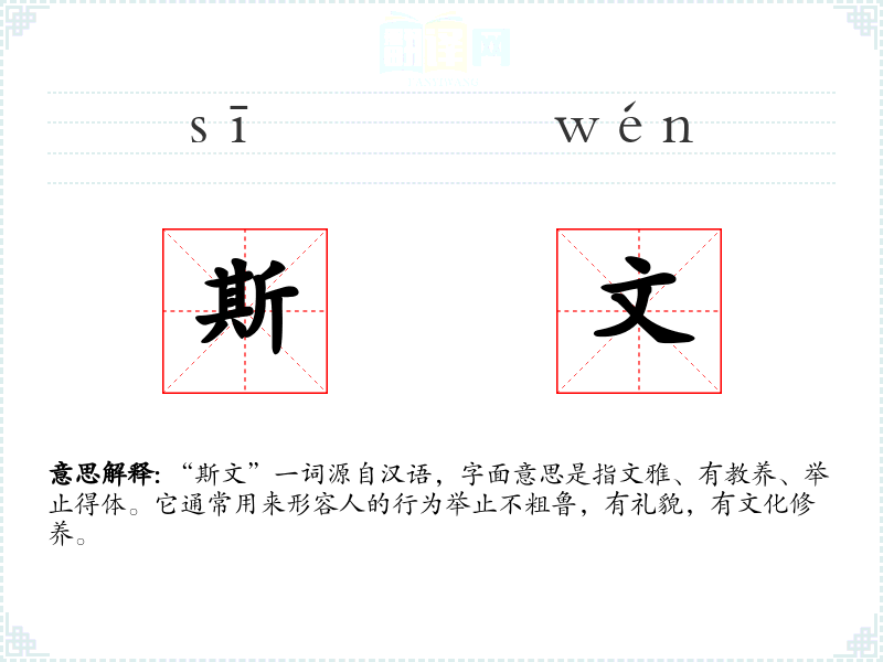 “斯文”一词源自汉语,字面意思是指文雅、有教养、举止得体。它通常用来形容人的行为举止不粗鲁,有礼貌,有文化修养。