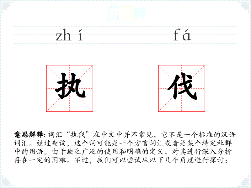 词汇“执伐”在中文中并不常见,它不是一个标准的汉语词汇。经过查询,这个词可能是一个方言词汇或者是某个特定社群中的用语。由于缺乏广泛的使用和明确的定义,对其进行深入分析存在一定的困难。不过,我们可以尝试从以下几个角度进行探讨: