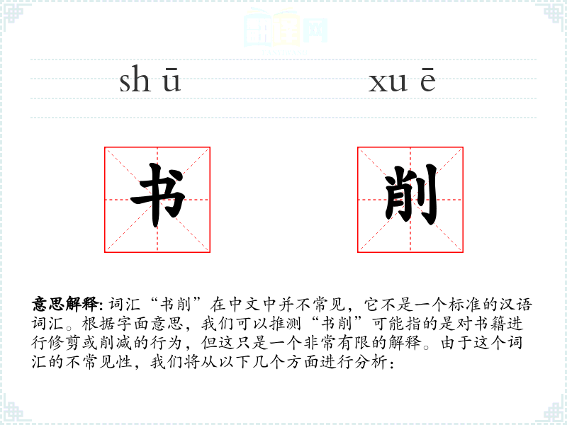 由于“书削”不是一个标准词汇,我们无法提供一个确切的基本定义。它可能是由“书”和“削”两个字组合而成的,其中“书”指的是书籍,“削”则有削减、修剪的含义。