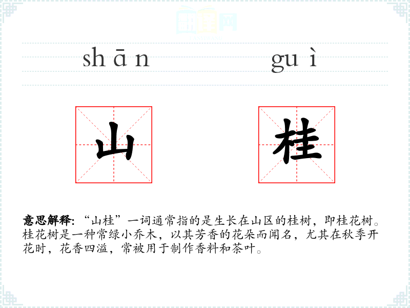 - 反义词:(由于“山桂”特指一种植物,反义词不适用)