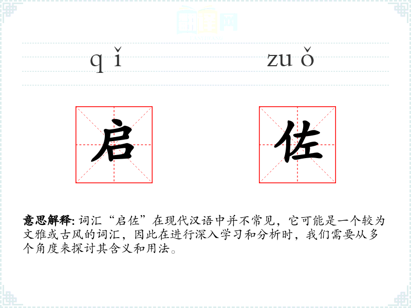 词汇“启佐”在现代汉语中并不常见,它可能是一个较为文雅或古风的词汇,因此在进行深入学*和分析时,我们需要从多个角度来探讨其含义和用法。