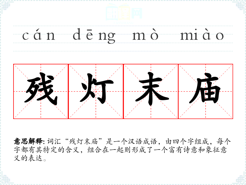 - “残灯”和“末庙”都是古代汉语中的常见词汇,组合成成语后,其意义更加丰富和象征化。