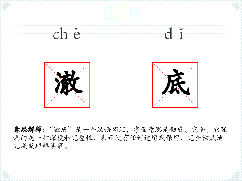 同义词中,“彻底”和“澈底”意思相近,但“澈底”更强调深度和完整性。“透彻”则侧重于理解的深度。反义词则表示与“澈底”相反的概念,如表面的、不深入的。