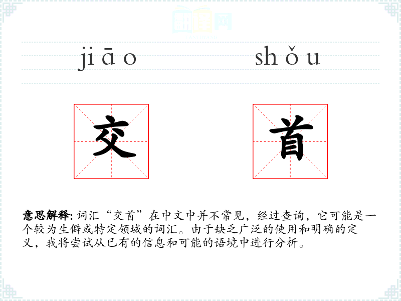 词汇“交首”在中文中并不常见,经过查询,它可能是一个较为生僻或特定领域的词汇。由于缺乏广泛的使用和明确的定义,我将尝试从已有的信息和可能的语境中进行分析。