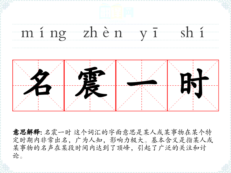 “名震一时”这个词汇源于汉语,由“名”、“震”和“一时”三个字组成。其中,“名”指名声,“震”指震动、影响,“一时”指某个特定时期。这个词汇在古代文献中已有使用,随着时间的推移,其含义和用法逐渐固定下来。