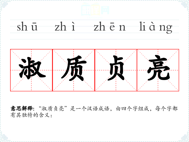 “淑质贞亮”是一个汉语成语,由四个字组成,每个字都有其独特的含义:
