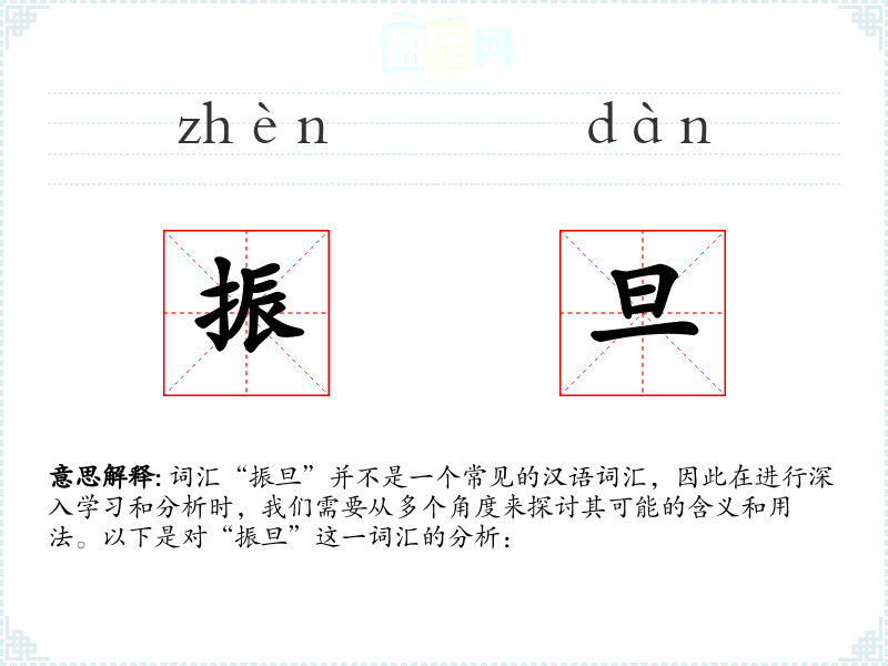 由于“振旦”不是一个常用词汇,它在不同语境下的使用并不广泛。如果存在特定语境,可能是在文学作品中作为象征性的表达,或者在某些专业领域中作为特定术语。