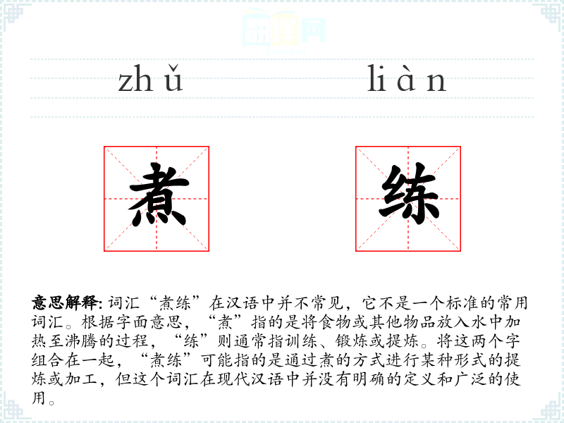 由于“煮练”不是一个常用词汇,它在不同语境下的使用非常有限。如果它出现在某个特定的行业或领域,可能是指某种特殊的煮制或提炼过程。
