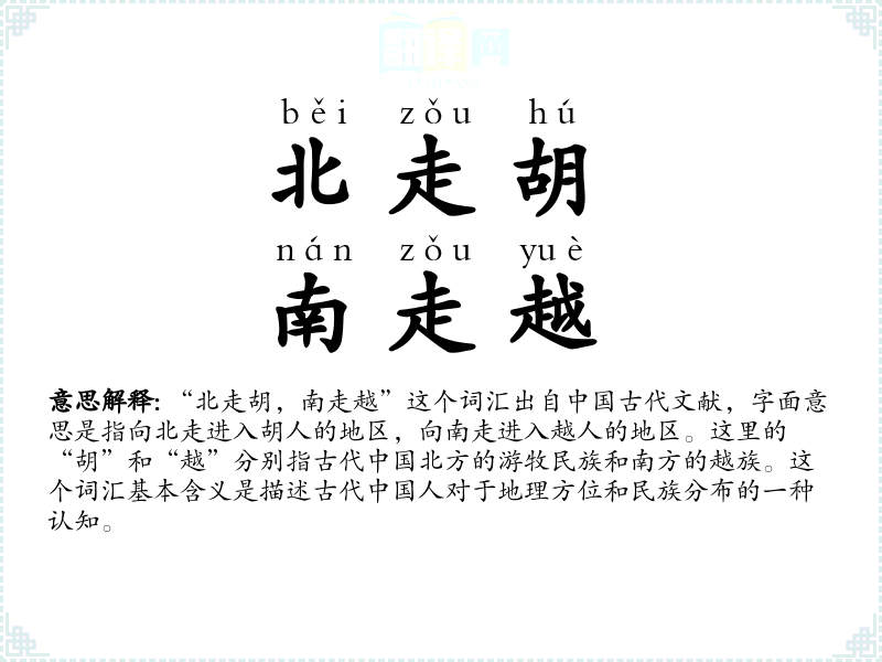 “北走胡,南走越”这个词汇出自古代文献,字面意思是指向北走进入胡人的地区,向南走进入越人的地区。这里的“胡”和“越”分别指古代北方的游牧民族和南方的越族。这个词汇基本含义是描述古代**人对于地理方位和民族分布的一种认知。