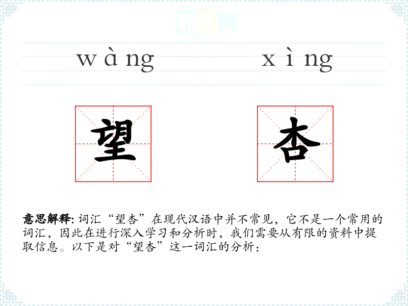词汇“望杏”在现代汉语中并不常见,它不是一个常用的词汇,因此在进行深入学*和分析时,我们需要从有限的资料中提取信息。以下是对“望杏”这一词汇的分析: