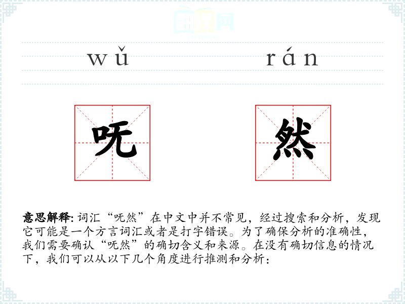 词汇“呒然”在中文中并不常见,经过搜索和分析,发现它可能是一个方言词汇或者是打字错误。为了确保分析的准确性,我们需要确认“呒然”的确切含义和来源。在没有确切信息的情况下,我们可以从以下几个角度进行推测和分析: