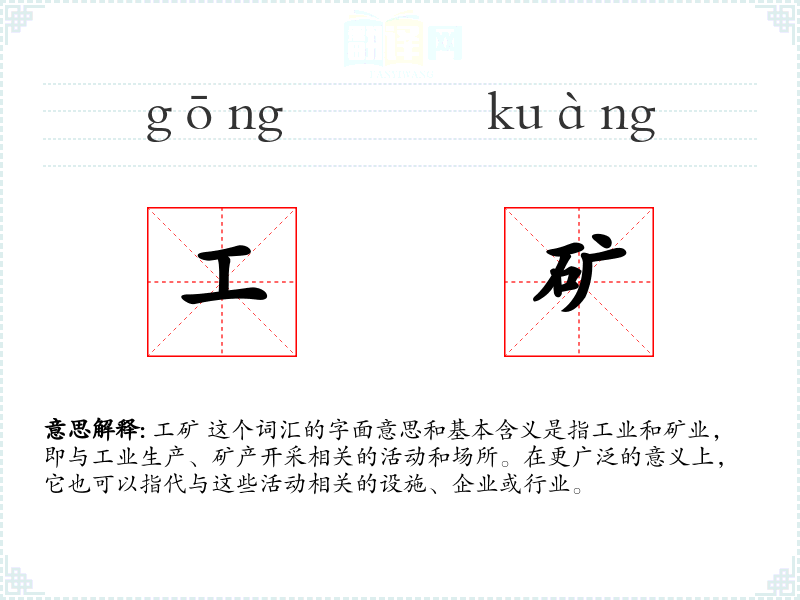 工矿 这个词汇的字面意思和基本含义是指工业和矿业,即与工业生产、矿产开采相关的活动和场所。在更广泛的意义上,它也可以指代与这些活动相关的设施、企业或行业。