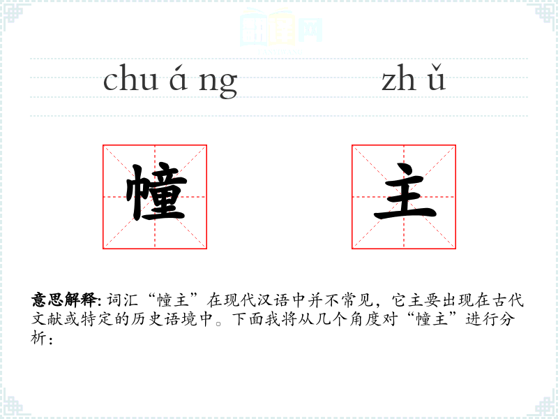 词汇“幢主”在现代汉语中并不常见,它主要出现在古代文献或特定的历史语境中。下面我将从几个角度对“幢主”进行分析:
