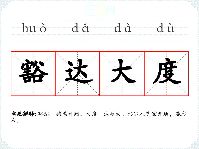 豁达:胸襟开阔;大度:试题大。形容人宽宏开通,能容人。