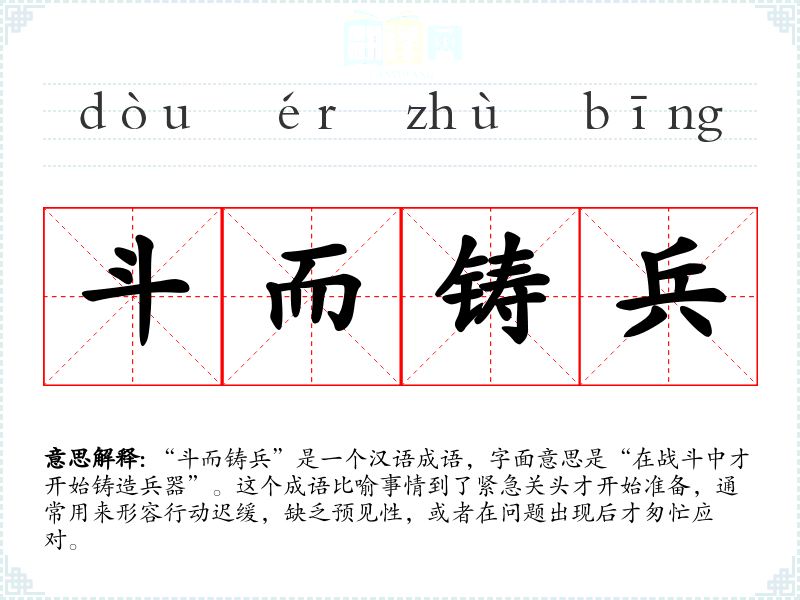 “斗而铸兵”出自《左传·宣公十五年》:“斗而铸兵,不亦晚乎?”这句话原本是用来批评那些在战争中才开始铸造兵器的行为,后来逐渐演变成一个成语,用来形容任何在紧急关头才开始准备的行为。