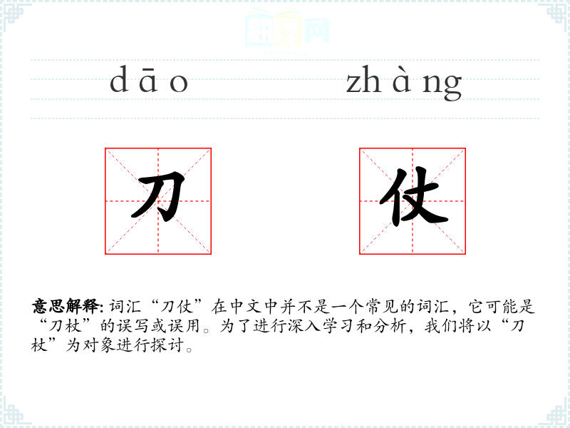 词汇“刀仗”在中文中并不是一个常见的词汇,它可能是“刀杖”的误写或误用。为了进行深入学*和分析,我们将以“刀杖”为对象进行探讨。