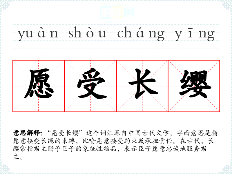 “愿受长缨”这个词汇源自**古代文学,字面意思是指愿意接受长绳的束缚,比喻愿意接受约束或承担责任。在古代,长缨常指君主赐予臣子的象征性物品,表示臣子愿意忠诚地服务君主。