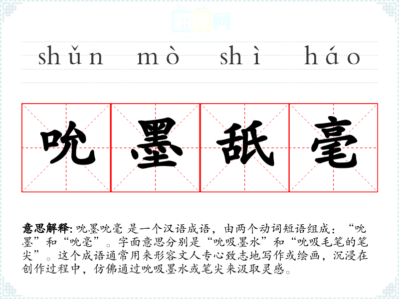 吮墨吮毫 是一个汉语成语,由两个动词短语组成:“吮墨”和“吮毫”。字面意思分别是“吮吸墨水”和“吮吸毛笔的笔尖”。这个成语通常用来形容文人专心致志地写作或绘画,沉浸在创作过程中,仿佛通过吮吸墨水或笔尖来汲取灵感。