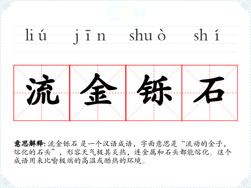 在英语中,类似的表达可能是“hot as hell”或“scorching hot”,但这些表达没有流金铄石 那样形象和生动。